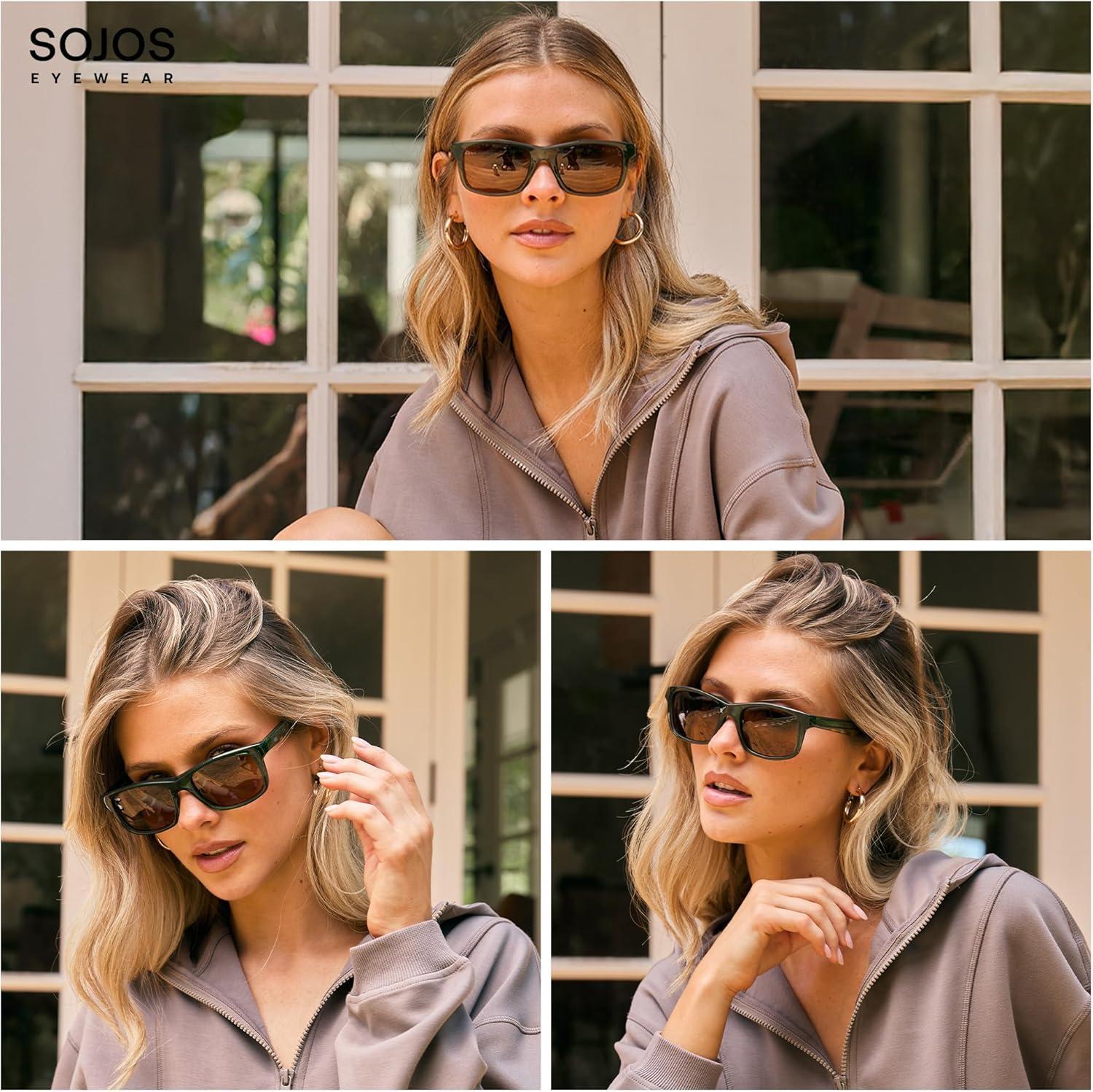 SOJOS Rectangle Polarized Sunglasses for Men Women Classic Acetate Frame UV Protective Wide Vision Shades SJ3115(Green/Brown)